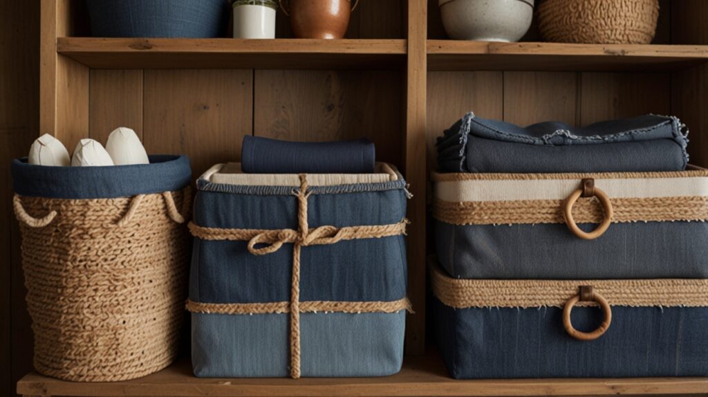 Cut dozens of denim strips about 1″ wide and 6–8″ long. Tie each one onto a length of jute or rope, double-knotting to secure. Vary the denim shades and textures, and mix in lace or burlap strips. Drape over mantels, shelves, or party tables. It adds cozy, crafty flair. How to create them: