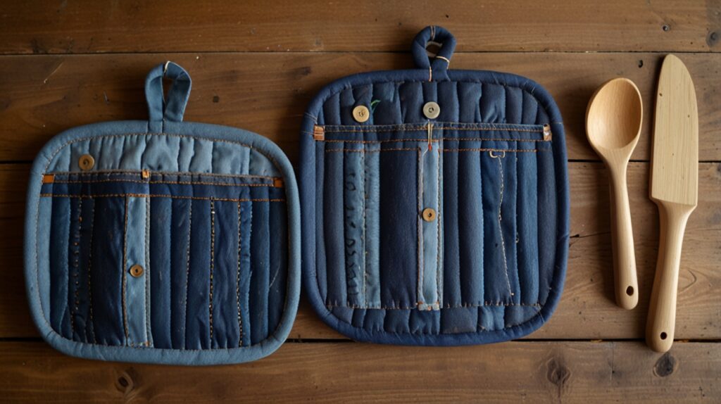 Layer two 8-inch denim squares with a piece of insulated batting (or even an old towel) sandwiched inside. Quilt them together using a crisscross stitch. Use bias tape or denim strips to finish the edges, and sew a loop in one corner for hanging. Super cute and practical for everyday cooking. Get full instructions here: