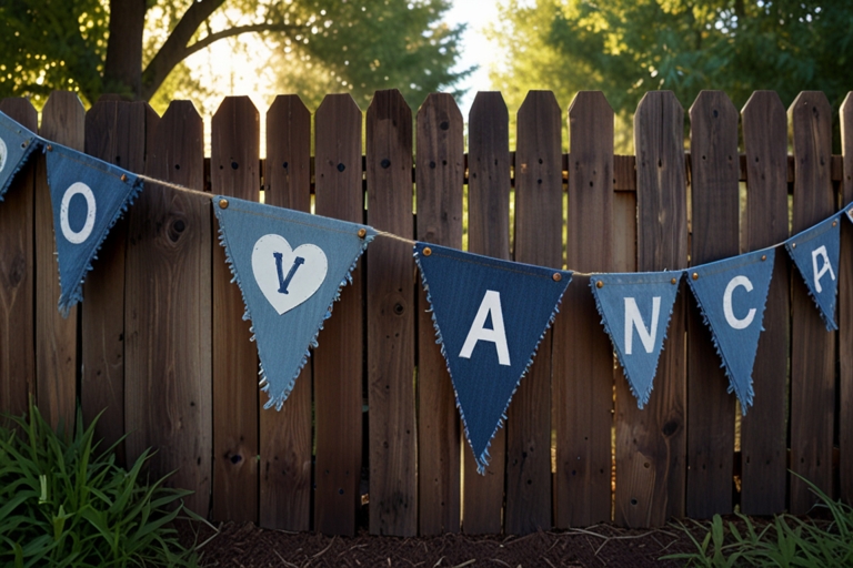 Cut flags (triangles or swallow-tails) from denim. Decorate with stencils, appliqué letters, or fabric paint. Sew or glue them to a length of ribbon or twine. Use to spell out names, party phrases, or just as festive decor. To learn how, click here: