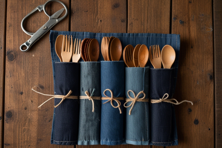 Cut a denim rectangle about 18″ x 10″. Fold one long edge up 5″ and sew vertical lines to make utensil slots. Add a flap over the top to protect contents when rolled. Attach a ribbon or strap to tie it shut. Perfect for outdoor dining or camping. Read here for full instructions:
