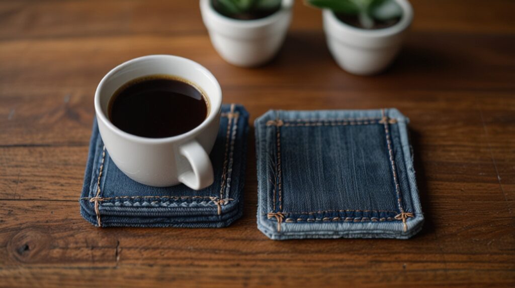 Make a mini placemat by layering two 5×8″ denim rectangles with quilt batting inside. Sew around the edges, then topstitch a pattern like stripes or chevrons. Great for coffee stations or as a thoughtful handmade gift. For more details and instruction, click here: