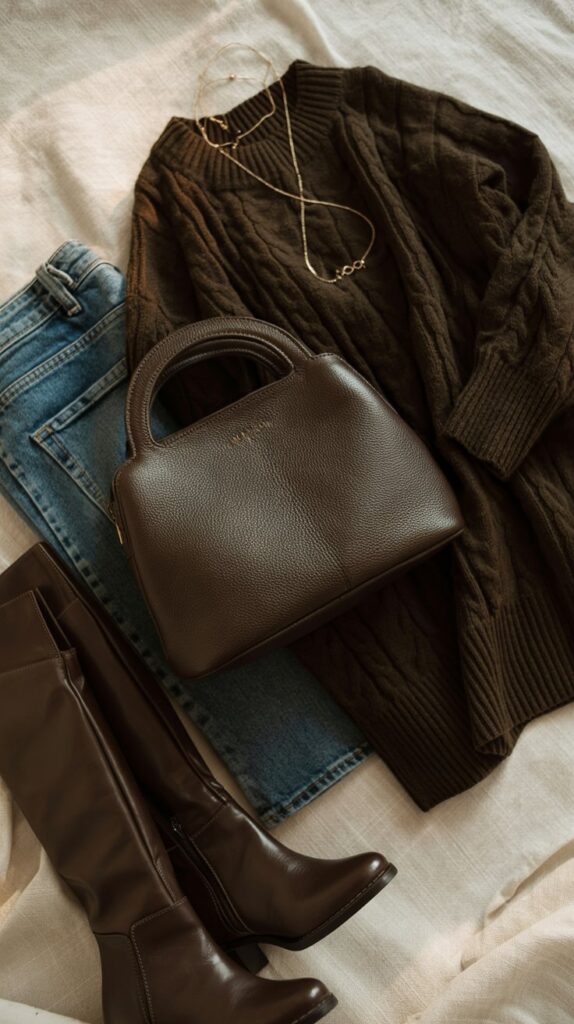 - Weekend Cozy → Oversized brown sweater + straight denim + ankle boots.