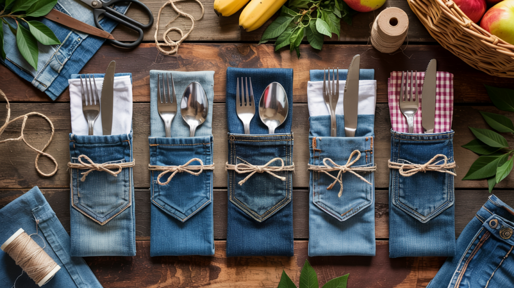 Whether you’re heading to a picnic, packing for camping, or just want to organize your reusable cutlery, these DIY Denim Utensil Rolls are a must-make. Made from old jeans and designed with function in mind, they roll up neatly and hold forks, knives, napkins—or even straws and chopsticks. Best part? They’re washable, durable, and look so cute.