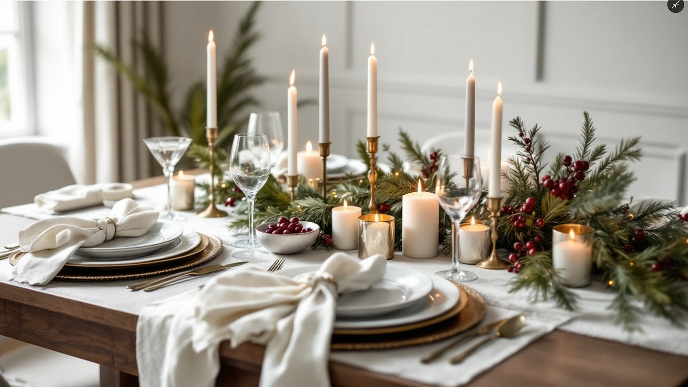 - Traditional Christmas: Think red, green, and gold. Layer plaid runners over rustic wooden tables, and use miniature poinsettias or holly sprigs as centerpieces. Napkin rings made of small wreaths or candy canes add a festive touch.
